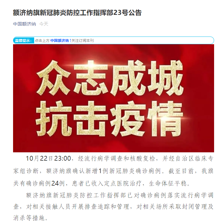 (內蒙古)額濟納旗新冠肺炎防控工作指揮部23號公告