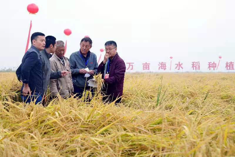 在濰坊寒亭區海水稻三產融合示范基地,專家組成員在進行測產。(2020年10月16日) 新華社記者 郭緒雷 攝
