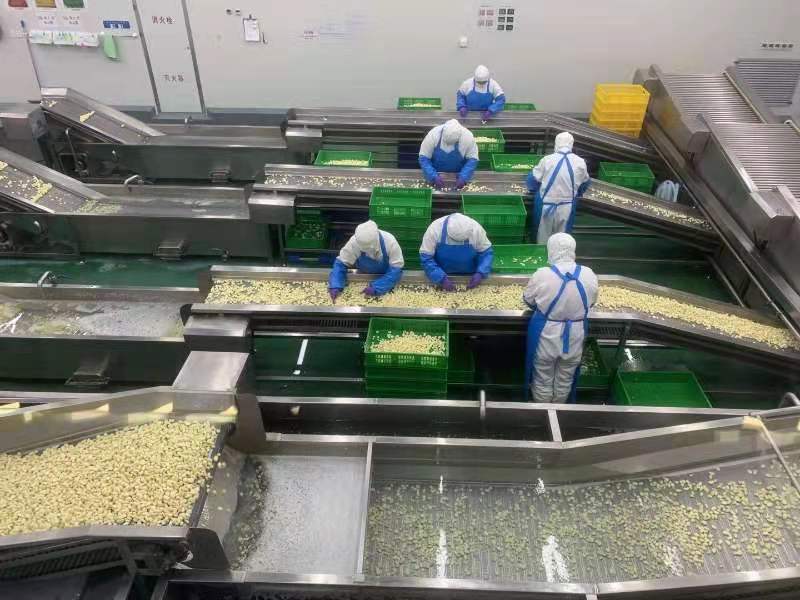在濰坊安丘市源清田食品有限公司車間,工作人員正在清選大蒜。(2021年3月16日) 新華社記者 張志龍 攝
