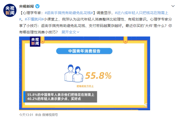 調查顯示,近六成年輕人只把錢花在剛需上。不懂就問小課堂上,倪萍認為這代年輕人消費整體比較理性、有規劃意識。心理學專家分享了小技巧:逛街手揣兜有助避免亂花錢、支付密碼越復雜越好。最近你買的“大件”是什么?你有哪些理性消費小技巧?