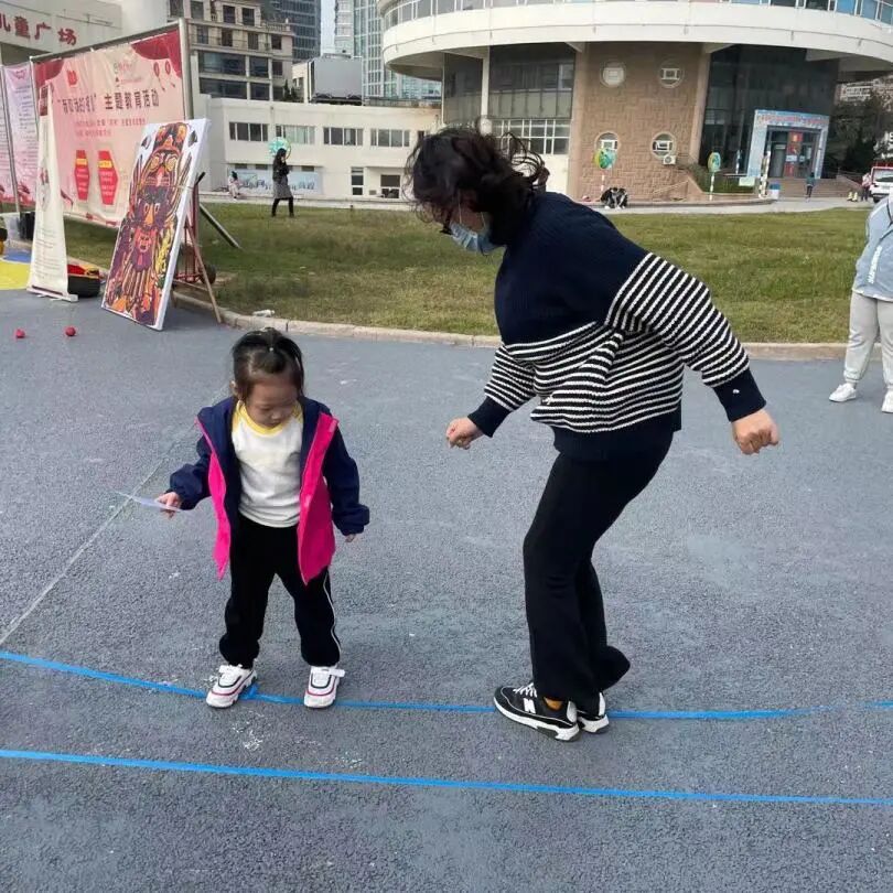 “小皮球,香蕉梨,馬蓮開花二十一。二五六,二五七,二八二九三十一….”,這邊的媽媽唱出兒時的歌謠,與小皮筋“共舞”起來。在陽光的照耀下,這時的媽媽如同年少時羊角辮小姑娘,像一只小蝴蝶般飛上飛下;媽媽,今天我來撐皮筋,你來跳,讓我來陪你一起嗨起來!