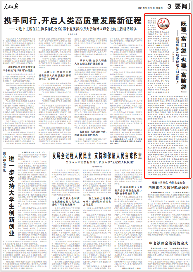 扎實推進共同富裕,一個重要方面就是要處理好“富口袋”和“富腦袋”的關系,既要家家“倉廩實衣食足”,實現物質生活水平提高,也要人人“知禮節明榮辱”,實現精神文化生活豐富,最終促進人的全面發展和社會全面進步。