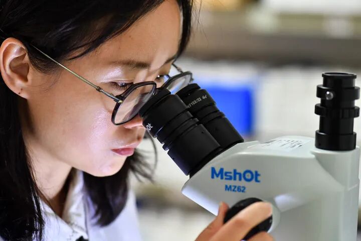 廣東省科學院動物研究所助理研究員俞雅麗在實驗室通過顯微鏡觀察海珠斯螢葉甲標本(10月25日攝)。新華社記者 劉大偉 攝
