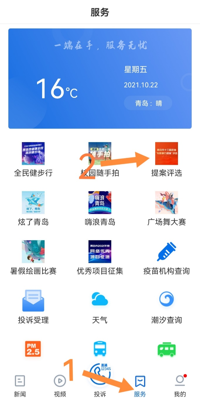 03 下載青島日報社(集團)觀海新聞APP,點擊底部“服務”,從“提案評選”進入投票