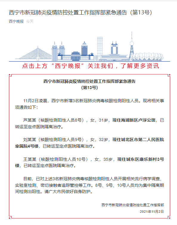 11月2日凌晨,西寧市新增3名新冠肺炎病毒核酸檢測陽性人員。現將相關事項通告如下: