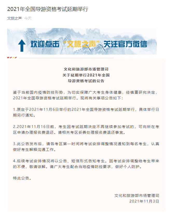 1.原定于2021年11月6日舉行的2021年全國導游資格考試延期舉行,具體舉行日期另行通知。