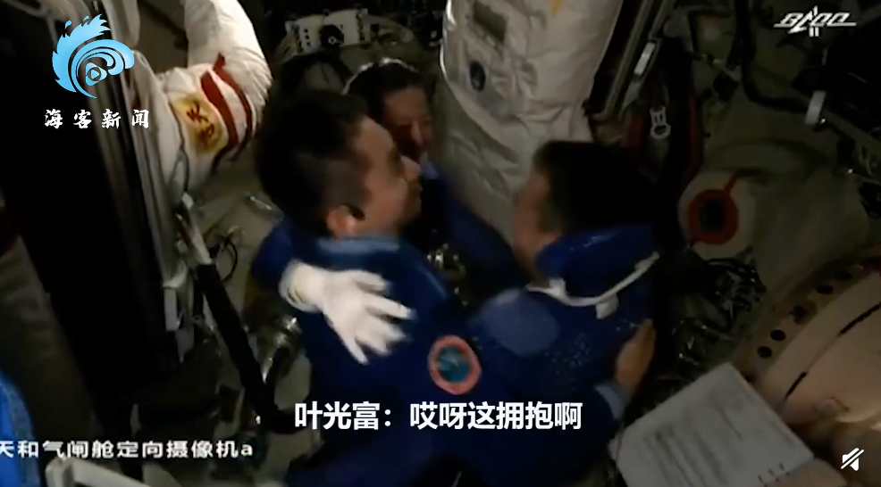 在出艙活動圓滿成功后,葉光富迎接翟志剛、王亞平進艙,三人組緊緊相擁慶祝出艙成功,場面令人感動!