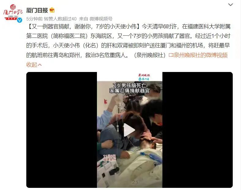 昨日,微博上一條有關器官捐獻的視頻引來萬千網友淚目點贊。福建省泉州市一名7歲男童小偉(化名)因車禍離世后,捐獻出眼角膜、雙腎和肝臟,其中雙腎和肝臟被送往青島和鄭州,救治3名危重病人。