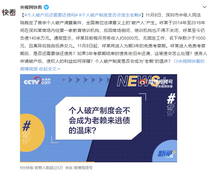 11月8日,深圳市中級人民法院裁定了首宗個人破產清算案件,全國首位法律意義上的“破產人”產生。呼某于2014年至2016年間在深圳某商場內經營一家教育培訓機構,后因商場倒閉,培訓機構也不得不關閉,呼某至今仍負債140余萬元。通報顯示,呼某目前每月勞務收入約5000元,無固定工作,名下存款少于1000元,且離異后獨自撫養女兒。11月8日起,呼某將進入為期3年的免責考察期。呼某進入免責考察期后,是否還需要償還債務?如果3年考察期結束時債務依舊未還清,這筆債會怎么處理?債務人申請破產后,債權人的利益如何保障?個人破產制度是否會成為“老賴”的溫床?