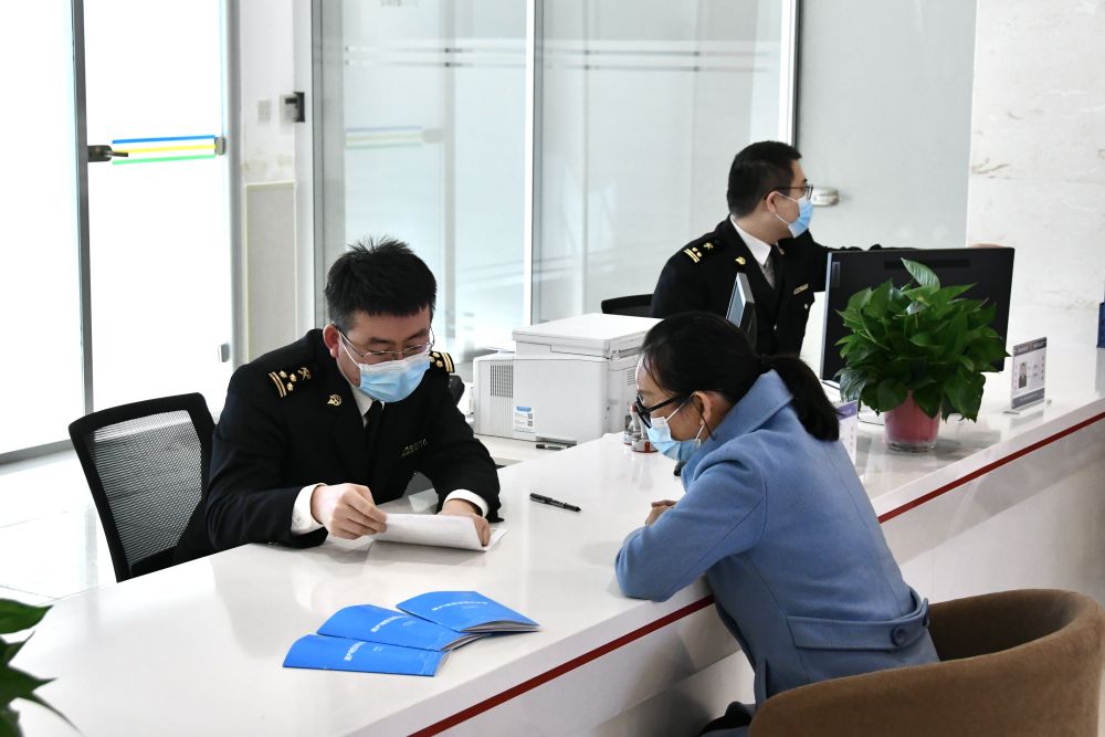 圖為上合示范區原產地證書審簽中心工作人員(左)在為前來辦業務的企業人員提供咨詢服務。(受訪者供圖)