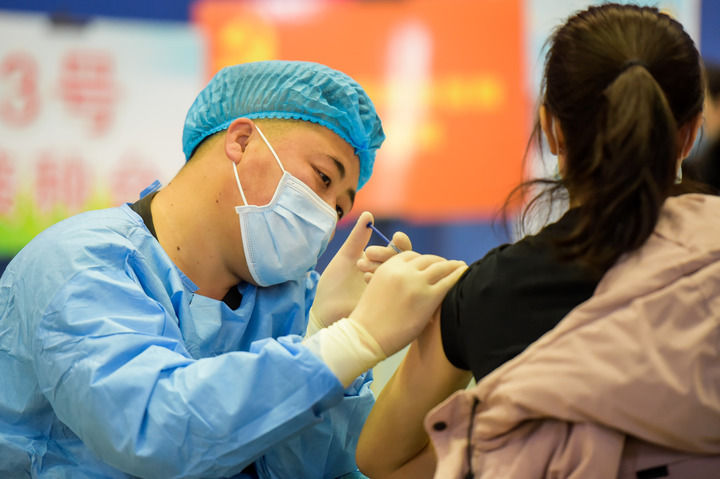 11月12日,在內蒙古自治區呼和浩特市,醫務人員為市民接種新冠病毒疫苗。(新華社記者李志鵬 攝)