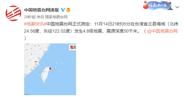 臺灣宜蘭縣海域發生4.8級地震 2021-11-14 21:16 中國地震臺網微博 0 中國地震臺網正式測定:11月14日21時05分在臺灣宜蘭縣海域(北緯24.58度,東經122.02度)發生4.8級地震,震源深度50千米。 微博截圖 責任編輯:榮瀟