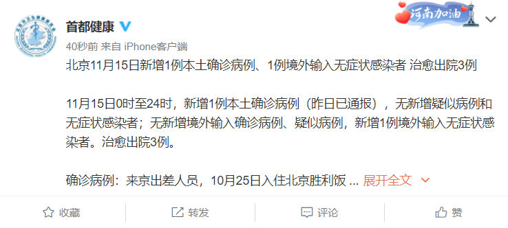 11月15日0時至24時,新增1例本土確診病例(昨日已通報),無新增疑似病例和無癥狀感染者;無新增境外輸入確診病例、疑似病例,新增1例境外輸入無癥狀感染者。治愈出院3例。
