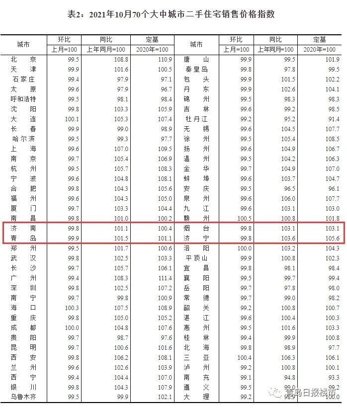 另根據國家統計局官方數據,除了青島之外,山東省的濟南、煙臺、濟寧三個城市也納入統計,山東四城的共同點是,在今年10月份新建商品住宅價格環比都出現了下跌。其中濟南10月新建商品住宅價格環比下降0.4%,同比上漲了5.2%;煙臺10月新建商品住宅價格環比下降了0.5%,同比上漲1.8%;濟寧9月新建商品住宅價格環比下降0.1%,同比上漲了7.6%。