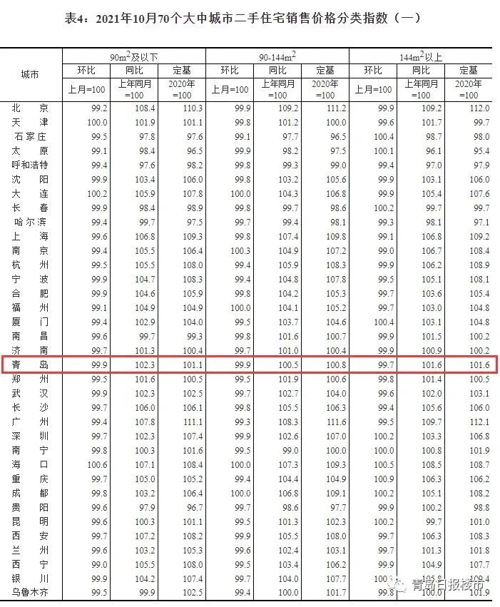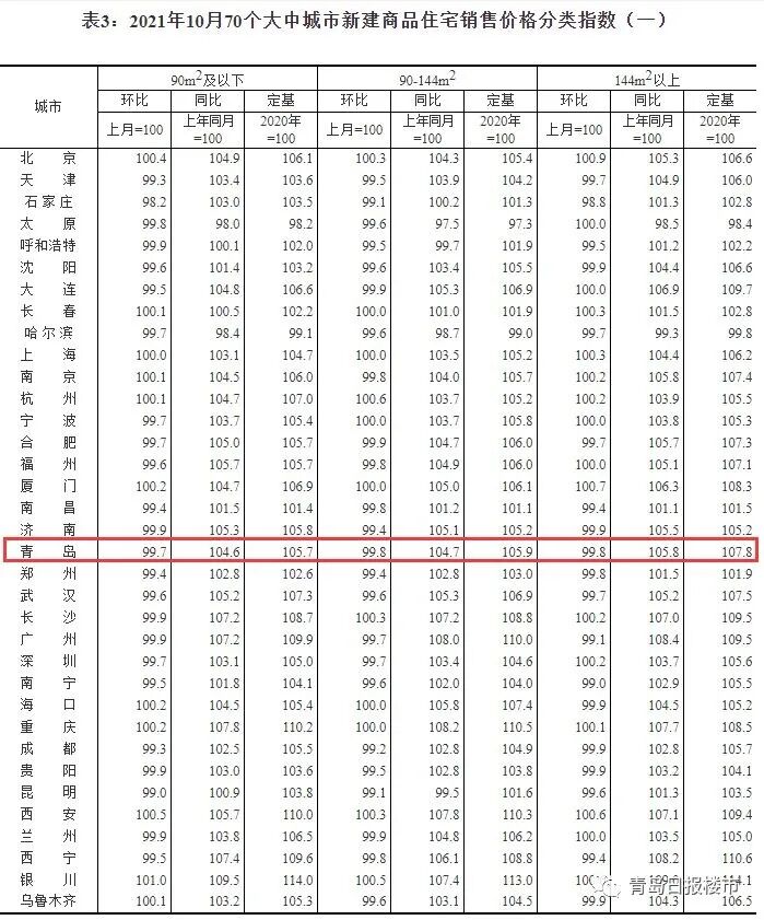 11月15日,國家統計局官方網站最新發布了2021年10月份70個大中城市商品住宅銷售價格變動情況統計數據。數據顯示,2021年10月青島新建商品住宅銷售價格環比下降0.2%;二手住宅價格環比下降0.1%。
