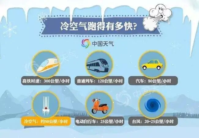 不同強(qiáng)度的冷空氣移速不同,弱冷空氣移速快于強(qiáng)冷空氣和寒潮。不同強(qiáng)度的冷空氣在陸地上移動的速度為每小時20至80公里,平均時速為50公里,相當(dāng)于汽車在城市道路中的行駛速度。