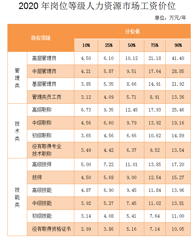 從發布情況看,與2019年相比,我省2020年工資價位崗位等級工資價位平均增長4.78%,其中技能類、管理類和專業技術類分別增長5.43%、4.83%、3.82%。