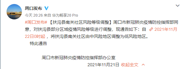 河南省周口市新冠肺炎疫情防控指揮部同意,對扶溝縣部分區域疫情風險等級進行調整,現通告如下:自2021年11月22日0時起 ,將扶溝縣南關社區由中風險地區調整為低風險地區。特此通告