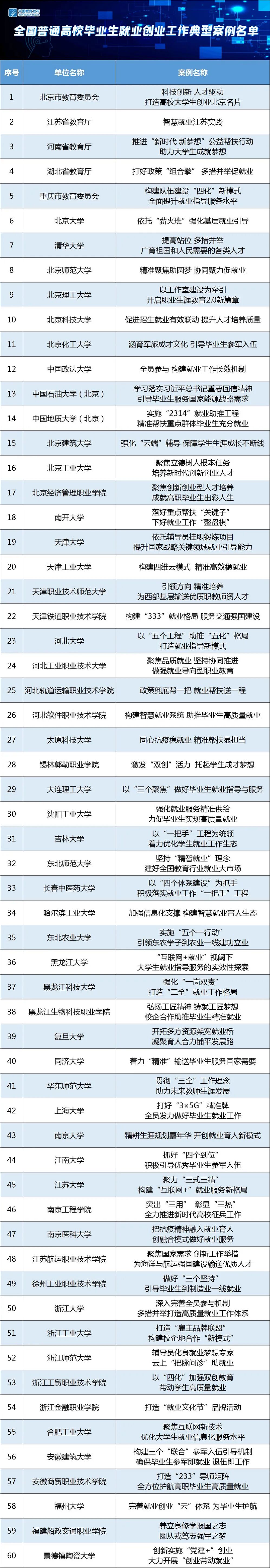 日前,教育部啟動全國普通高校畢業生就業創業工作典型案例總結宣傳工作,經各地各高校申報推薦,專家擇優遴選,確定了100個典型案例。11月26日,教育部發布公告,公布了這100個典型案例名單。