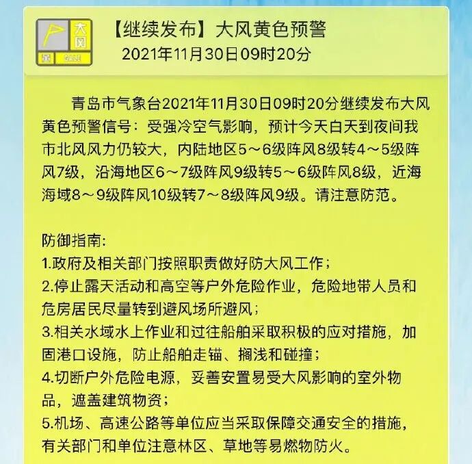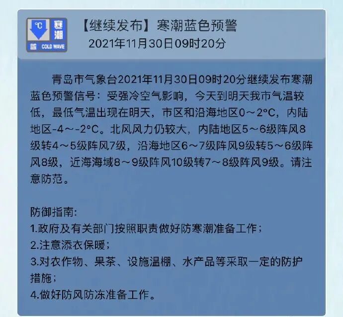 目前,寒潮藍色預警信號、大風黃色預警信號正在生效中。