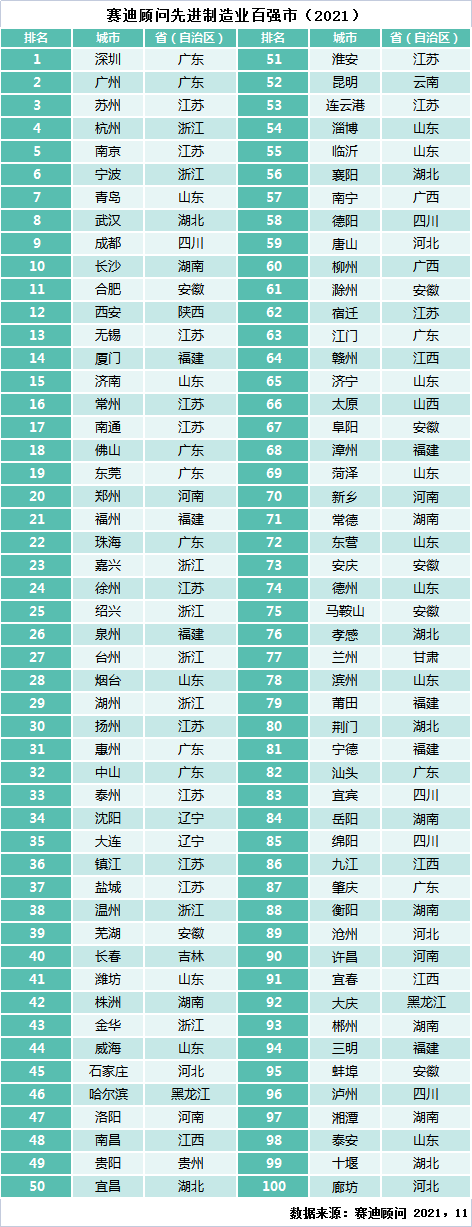 11月29日,工業和信息化部直屬單位賽迪研究院賽迪顧問發布《先進制造業百強市(2021)》,通過創新能力、融合發展、經濟帶動、品牌質量和綠色集約五個維度27項指標,對全國293個地級市的先進制造業發展情況進行系統研究和綜合評估。結果顯示,深圳、廣州、蘇州、杭州、南京、寧波、青島、武漢、成都、長沙、合肥進入榜單前十名。