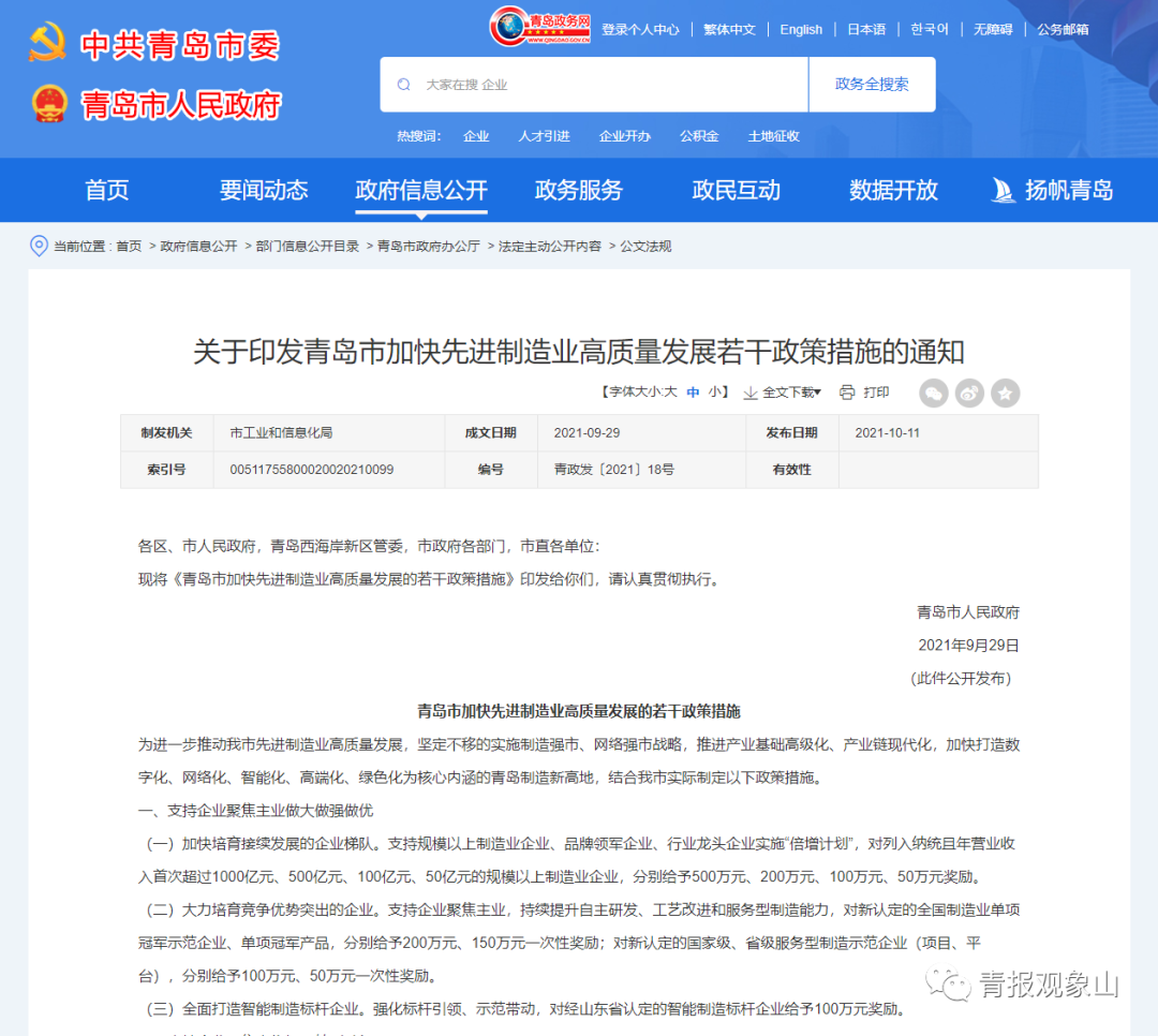 11月1日的青島企業家日座談會上,青島出臺《青島市加快先進制造業高質量發展的若干政策措施》(簡稱《政策措施》),5大方向18條“新政”在持續壯大制造業企業、補齊產業短板等方面精準施策,充分激發企業家創意創新活力,從而加快推動青島先進制造業發展。