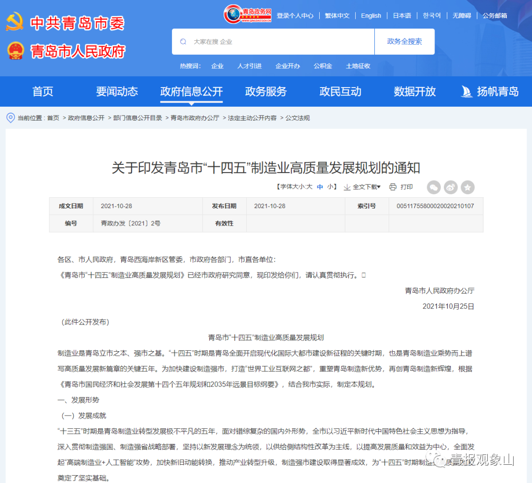 青島“十四五”規劃《綱要》也把先進制造業擺在十分重要的位置,全文26次提到“制造業”,明確提出,保持制造業比重穩中有升,實現制造業高質量發展,重塑“青島制造”優勢,打造具有國際競爭力的先進制造業集群。
