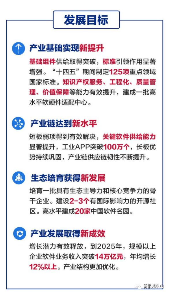 軟件是新一代信息技術的靈魂,是數字經濟發展的基礎,是制造強國、網絡強國、數字中國建設的關鍵支撐。《“十四五”軟件和信息技術服務業發展規劃》提出,提升關鍵軟件供給能力,加快繁榮開源生態,夯實產業發展基礎,提高產業鏈供應鏈現代化水平,壯大信息技術應用創新體系,到2025年,規模以上企業軟件業務收入突破14萬億元。