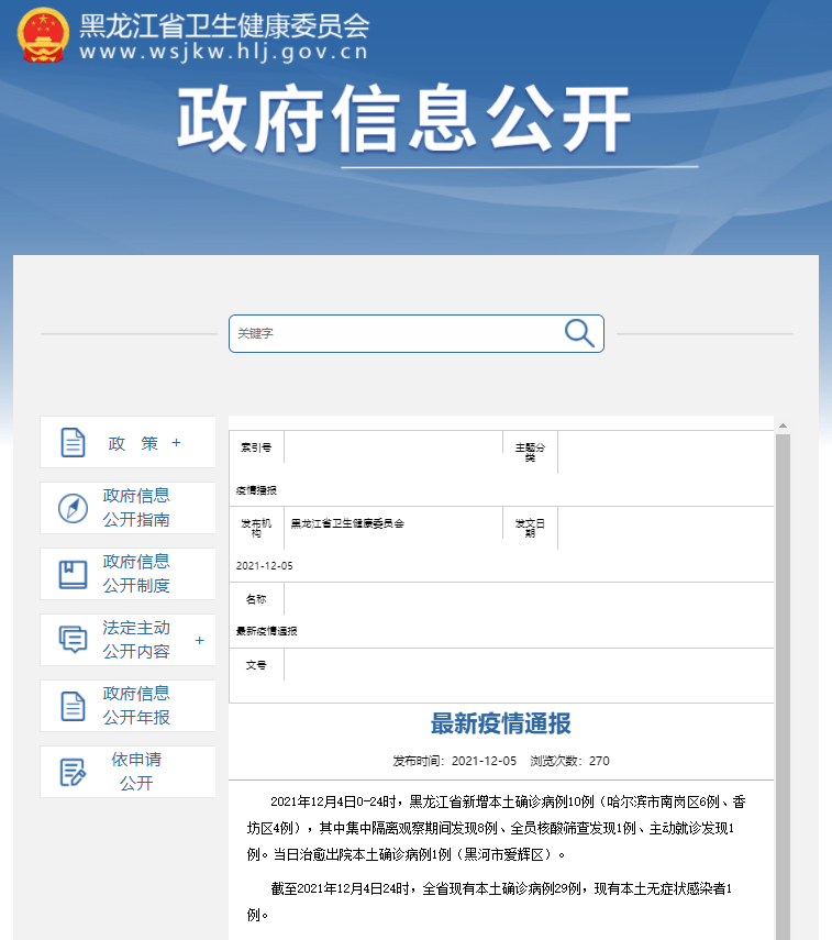 2021年12月4日0-24時,黑龍江省新增本土確診病例10例(哈爾濱市南崗區6例、香坊區4例),其中集中隔離觀察期間發現8例、全員核酸篩查發現1例、主動就診發現1例。當日治愈出院本土確診病例1例(黑河市愛輝區)。