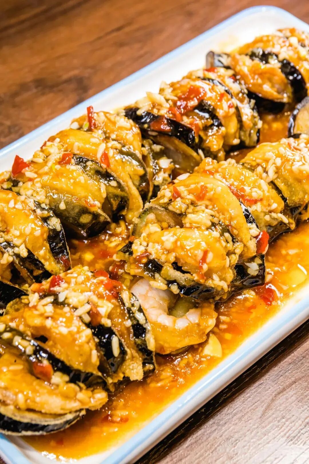 四層茄子三層蝦仁,每一個都超大,油炸后酥酥脆脆。更特別的是澆汁,用了酒糟+蒜蓉辣醬調(diào)味,融入魯菜的咸鮮。南北結(jié)合,微辣中又保持著山東人習慣的口味。