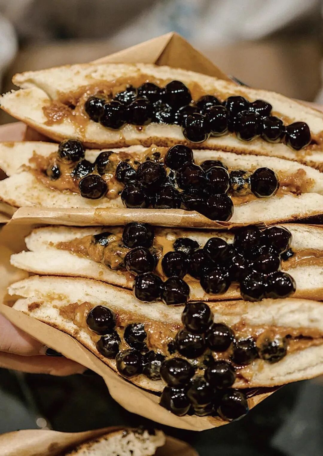 吐司表面微微焦褐,烤得酥脆,一咬滿口爆漿。順滑香甜的奶黃醬包裹著Q彈軟糯的黑糖珍珠,看到的、吃到的都是大寫的滿足!