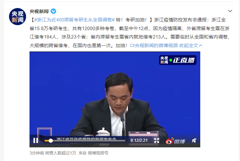 浙江疫情防控發布會通報:浙江全省15.8萬考研考生,共有12000多種考卷,截至中午12點,因為疫情隔離,外省滯留考生需在浙江借考184人,涉及23個省;省內滯留考生需省內就地借考213人。需要臨時從全國和省內調卷,大規模的跨省借考,在國內也是第一次。加油!