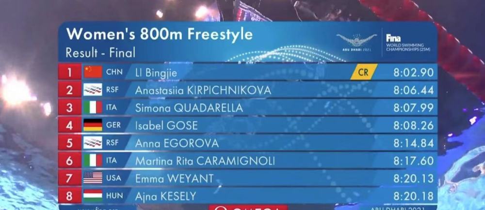 短池游泳世錦賽:李冰潔奪得女子800米自由泳冠軍并打破賽會紀錄 2021-12-20 07:20 ?新華社 0 新華社阿布扎比12月18日電 18日在阿聯酋阿布扎比進行的第15屆國際泳聯世界短池游泳錦標賽上,中國選手李冰潔以8分02秒90的成績獲得女子800米自由泳冠軍,同時打破賽會紀錄。 責任編輯:程雪涵