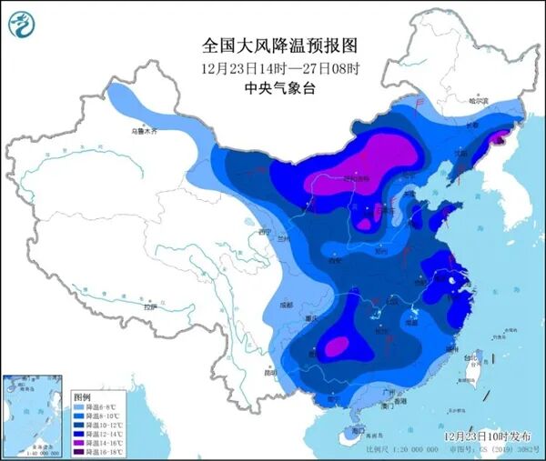 受寒潮影響,預計12月23日至26日,我國中東部地區自北向南將先后出現4~5級風,陣風6~8級;氣溫普遍下降6~10℃,其中,內蒙古中西部、華北北部和西部、東北地區南部、黃淮東部、江淮東部、江南東部以及貴州東部、湖南西部等地的部分地區降溫12~14℃,局地14℃以上;28日前后,最低0℃線將位于江南南部至貴州南部一帶。我國東部和南部海域將先后有7~9級大風,陣風10級左右。