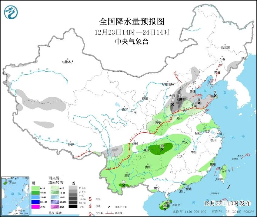 今天開始到26日,伴隨著冷空氣南下,同時配合南支槽輸送的水汽,華北中南部及其以南地區將出現雨雪天氣,總體來看以小到中雨雪為主。華北黃淮一帶的降雪主要集中在23日至24日,長江中下游降水則主要在24日至25日。