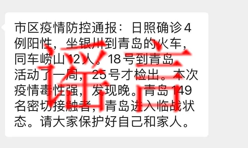近日,有網民在微信傳播“市區疫情防控通報:日照確診4例陽性,坐銀川到青島的火車,同車嶗山12人。青島149名密切接觸者,青島進入臨戰狀態。”近期,我市未發生此類情況,系謠言。