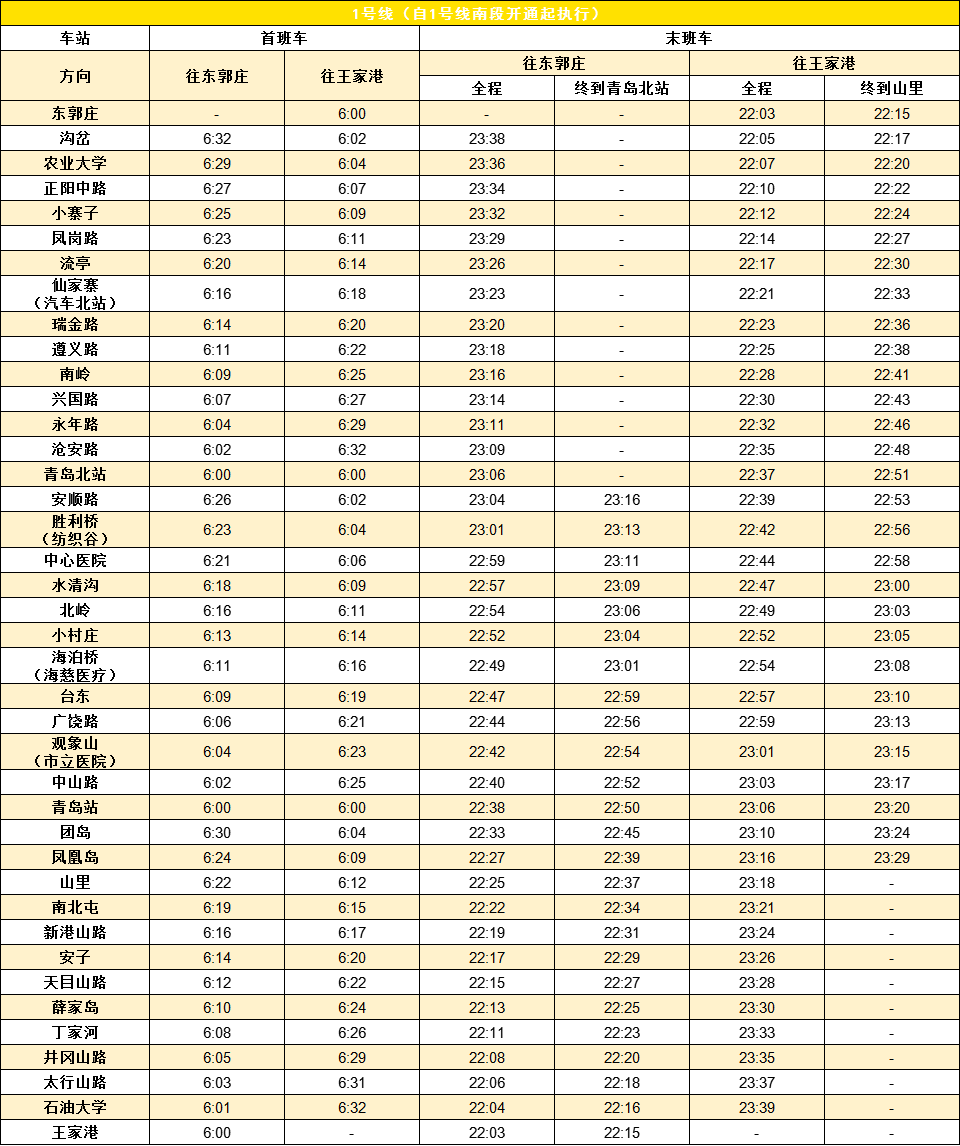 在此提醒乘客朋友們合理安排出行時間,各站首末班車時間可以通過青島地鐵App、官方微信查詢。自12月31日起,1號線各站首末班車時間如圖所示: