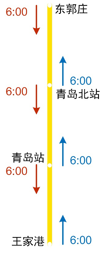 首班車除在兩端站(東郭莊、王家港)各安排一列車始發外,同時在青島北站和青島站各安排兩列車向雙方向發車,6列車在上述車站發車的時間均為6:00。