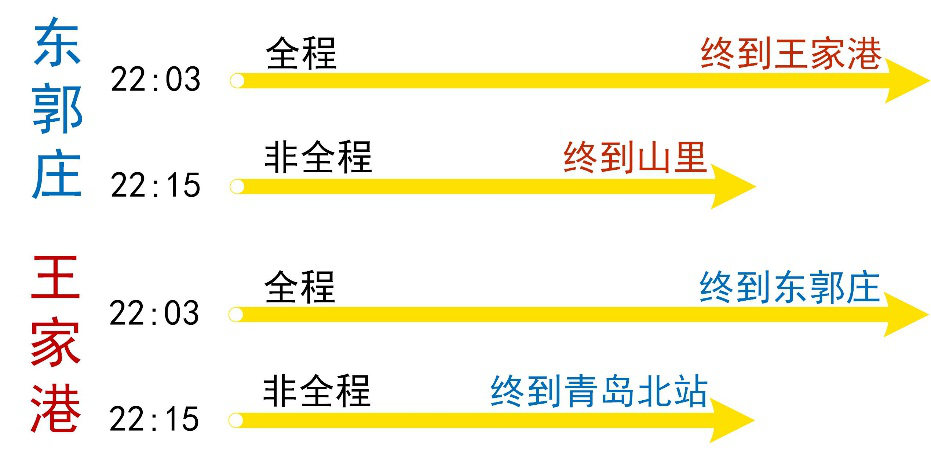末班車分為全程末班車和非全程末班車。全程末班車在東郭莊、王家港的發車時間均為22:03。兩端站(東郭莊、王家港)將在常規全程末班車后各開行一列非全程末班車,非全程末班車在兩端站的發車時間均為22:15,東郭莊始發的列車終到山里,王家港始發的列車終到青島北站。