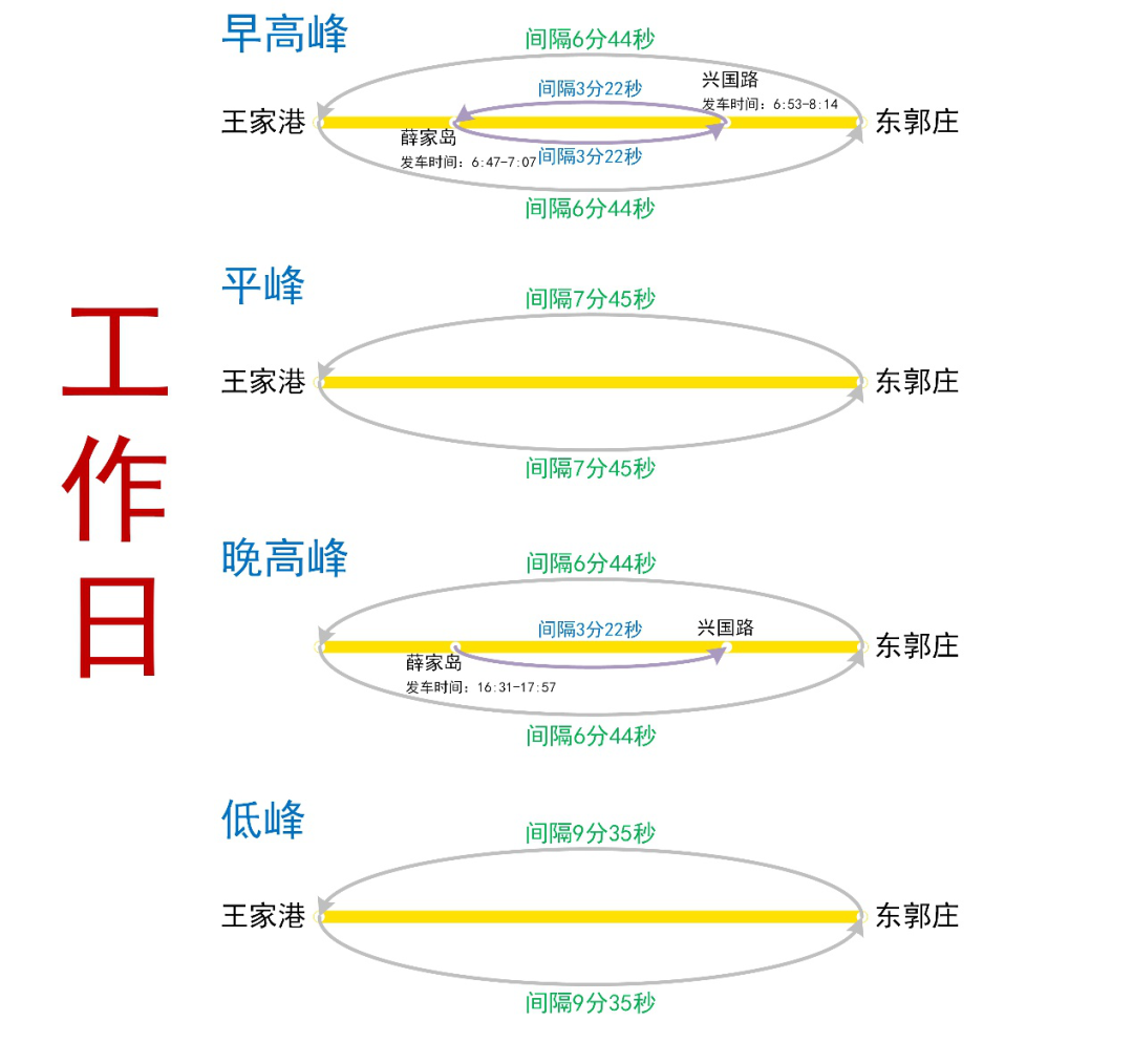 其中工作日早高峰興國路-薛家島小交路列車雙向開行,晚高峰小交路僅薛家島-興國路單向開行。運營工作日早晚高峰大交路(王家港-東郭莊)行車間隔 6 分 44 秒,小交路(薛家島-興國路)行車間隔 3 分 22秒;平峰行車間隔 7 分 45 秒。周末高峰行車間隔 7 分;平峰行車間隔 8 分 45秒。具體的行車安排大家可以看下方圖片。