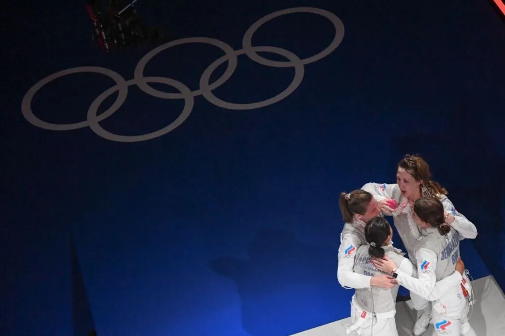 這是2021年7月29日,俄羅斯奧運選手在東京奧運會女子花劍團體決賽后擁抱。新華社記者徐子鑒攝