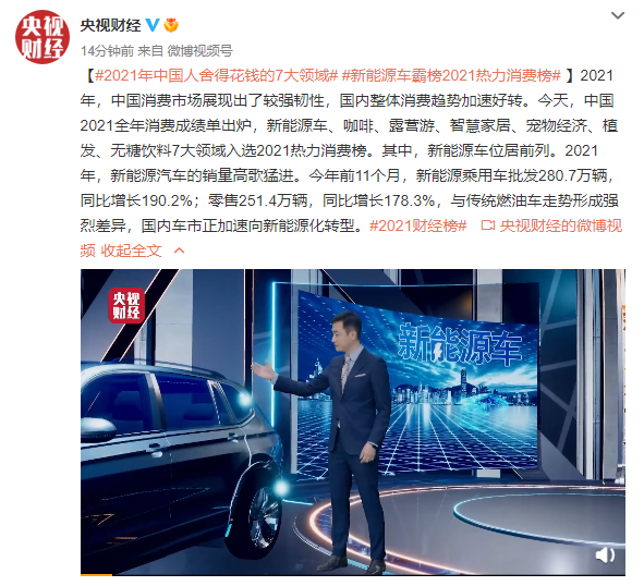 2021年,中國消費市場展現出了較強韌性,國內整體消費趨勢加速好轉。今天,中國2021全年消費成績單出爐,新能源車、咖啡、露營游、智慧家居、寵物經濟、植發、無糖飲料7大領域入選2021熱力消費榜。其中,新能源車位居前列。2021年,新能源汽車的銷量高歌猛進。今年前11個月,新能源乘用車批發280.7萬輛,同比增長190.2%;零售251.4萬輛,同比增長178.3%,與傳統燃油車走勢形成強烈差異,國內車市正加速向新能源化轉型。