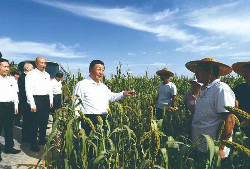 2021年9月13日下午,習近平在陜西榆林市米脂縣銀州街道高西溝村,察看糧食作物長勢,同正在田間勞作的老鄉拉家常。新華社記者 李學仁攝