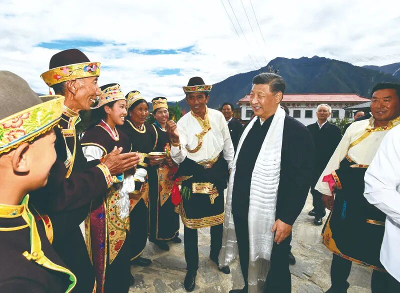 2021年7月21日下午,習近平在西藏林芝市巴宜區林芝鎮嘎拉村,同村民達瓦堅參一家親切交流。新華社記者 謝環馳攝