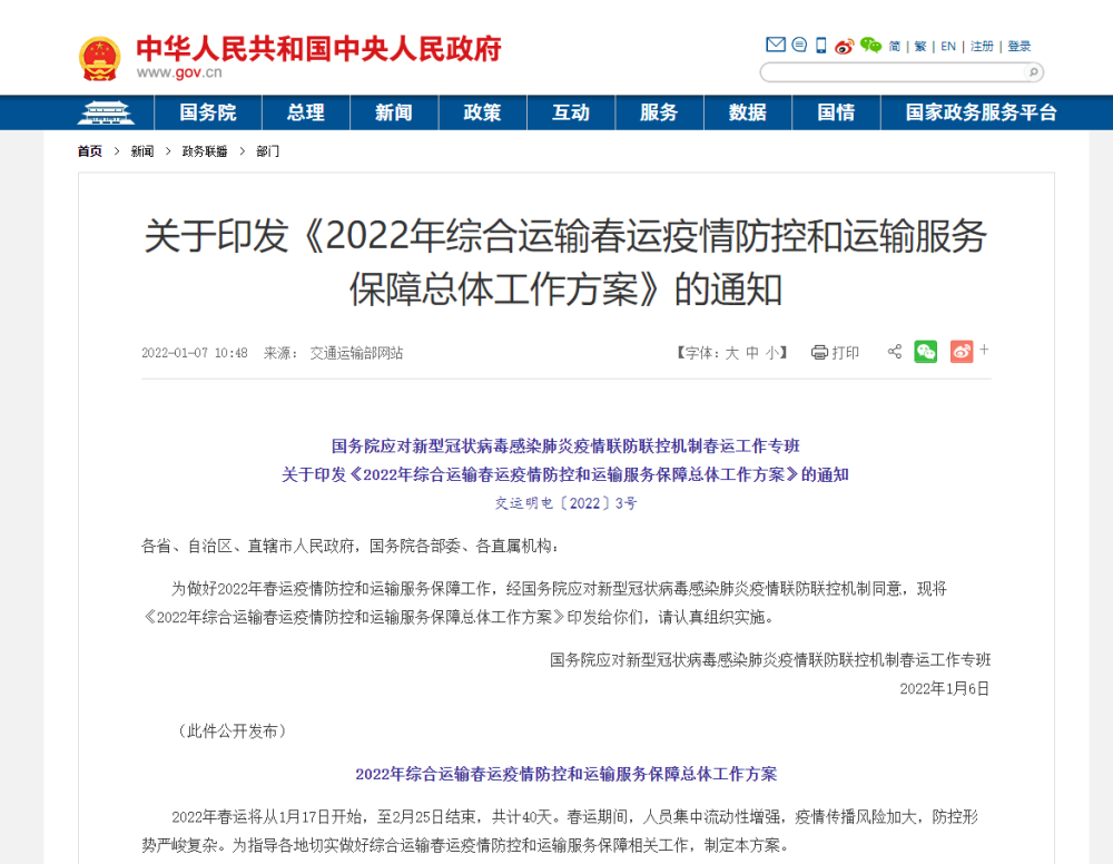 為做好2022年春運疫情防控和運輸服務保障工作,經國務院應對新型冠狀病毒感染肺炎疫情聯防聯控機制同意,現將《2022年綜合運輸春運疫情防控和運輸服務保障總體工作方案》印發給你們,請認真組織實施。