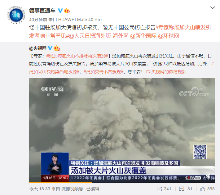 湯加火山噴發,中國大使館:暫無我公民傷亡報告 2022-01-16 21:23 ?外交部領事保護中心官方微博 0 南太平洋島國湯加的洪阿哈阿帕伊島14日和15日發生火山噴發,首都努庫阿洛法觀測到海嘯。1月16日,據外交部領事保護中心官方微博消息,經中國駐湯加大使館初步核實,暫無中國公民傷亡報告。 微博截圖 責任編輯:程雪涵