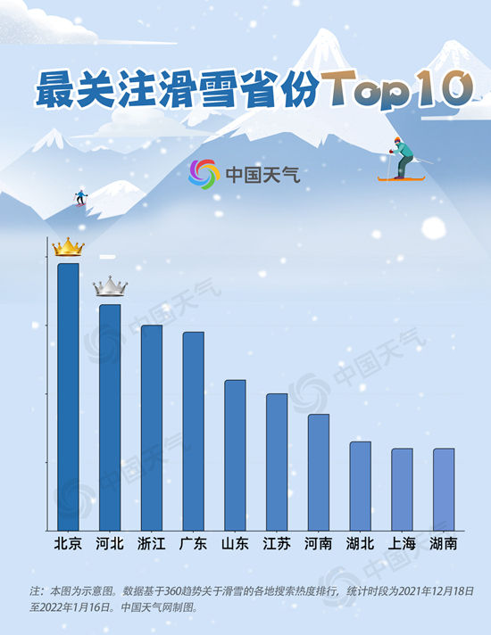 統計近一個月搜索滑雪的網友,按地域分布,可以看出冬奧會舉辦地對冰雪運動熱情高漲,北京、河北分別占據了排行榜冠亞軍位置。浙江、廣東緊隨其后位列三四位。在10個滑雪高關注度省份中,南方省份超過一半,可見南方人民對冰雪的向往。