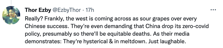 更有網(wǎng)友一針見(jiàn)血:“說(shuō)實(shí)話,西方嫉妒中國(guó)取得的每一個(gè)成功。他們甚至要求中國(guó)取消‘清零’政策,其險(xiǎn)惡用心昭然若揭。正如他們的媒體所表現(xiàn)出的歇斯底里一樣,西方目前的狀況是可笑至極的。”