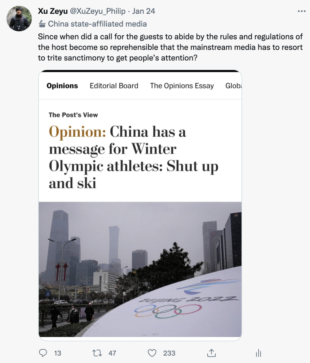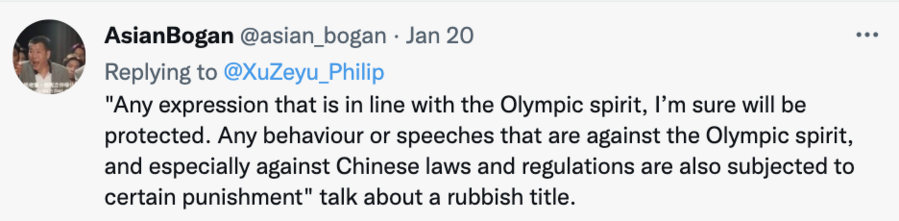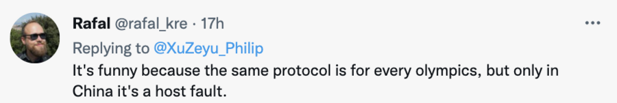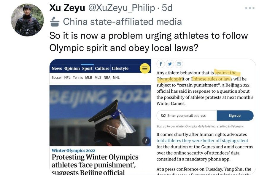 為此,新華社記者徐澤宇在推特上質(zhì)問(wèn)這篇報(bào)道:“難道提醒運(yùn)動(dòng)員堅(jiān)持奧林匹克精神和遵守當(dāng)?shù)胤煞ㄒ?guī)也有錯(cuò)嗎?”