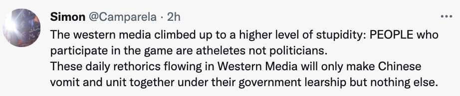 一名叫作Simon的網(wǎng)友指出外媒的這種不實(shí)報(bào)道只會(huì)起到適得其反的效果:“西方媒體的愚蠢再次登峰造極,別忘了,參加冬奧會(huì)的人是運(yùn)動(dòng)員而不是政客。這些言論只會(huì)使中國(guó)人在政府的領(lǐng)導(dǎo)下更加團(tuán)結(jié)。”
